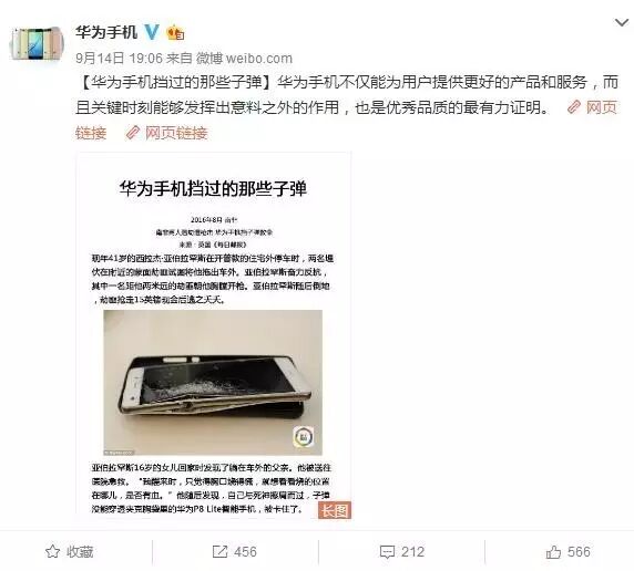 挡弹事件在引起国内媒体关注后,华为官方的回应使这个事件更加具有话题性,华为官方微博@华为手机 发布名为“华为手机挡过的那些子弹”的长图,不但明确指出此次挡弹手机的具体机型,还列举了另外两次华为的挡弹事件。