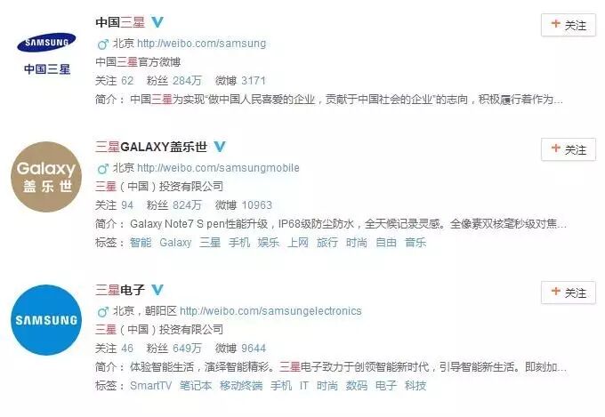 只在网站发布公告,三星中国几乎放弃所有在主流新媒体平台解释的机会。三星中国有3个官方微博账号,分别是284万粉丝的@中国三星、824万粉丝的@三星GALAXY盖乐世、649万粉丝的@三星电子,这3个微博账号用处似乎只是发发官方宣传图问安,丝毫没能为他们的公关和营销助力。