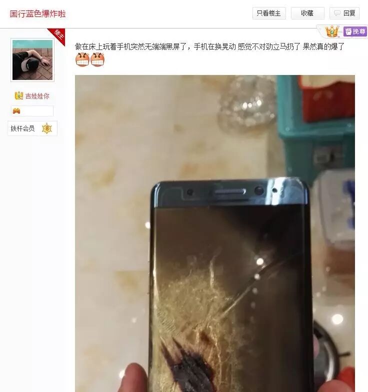 18日,有媒体报道,百度Note7吧的网友@吉娃娃你 在贴吧晒图爆料,称自己9月2日到货的京东国行三星Note 7(珊瑚蓝色)突然爆炸。从网爆的贴吧截图来看,Note 7黑屏,屏幕部分碎裂且呈现焦黄色。
