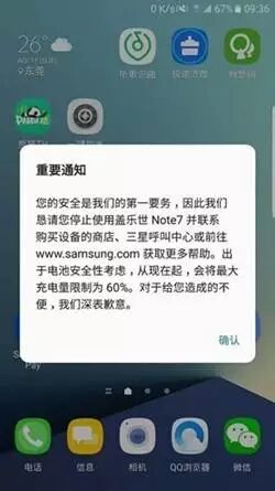 这次更新是强制性更新,更新之后的系统将充电至60%,由之前的3500毫安时电量降至更新后的2100毫安时,并且只有通过换机的方式才能解决此问题。但正式发售国行版的Note 7是否享受这一待遇还是个未知数。