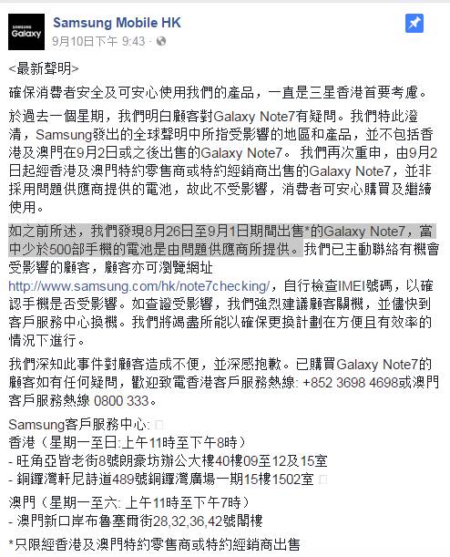 而在墙外的Facebook上,三星官方的反应却是截然不同的,@Samsung Mobile HK在9月2日、3日、10日接连发布声明,声明的内容一次比一次详细,道歉并召回问题手机,甚至公布了首批正式发售Note 7的调查数据“当中少于500部手机的电池是由问题供应商所提供”。
