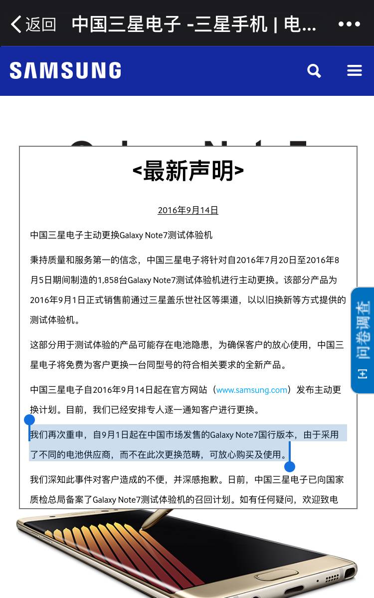 上文提到,三星中国在官网上发布了声明,声明中明确表达了3件事:(1)主动撤回Galaxy Note7测试体验机,并向国家质检总局备案;(2)9月1日起在中国市场发售的Galaxy Note7国行版没有问题,请大家放心买;(3)一句话道歉。
