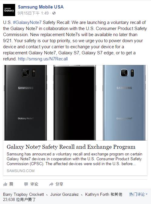 @Samsung Mobile USA 也及时发布3条与爆炸相关的回应,最近一次回应在15日,公布了详细召回计划,截止至今日下午5点,获得了近1.21w的转发。