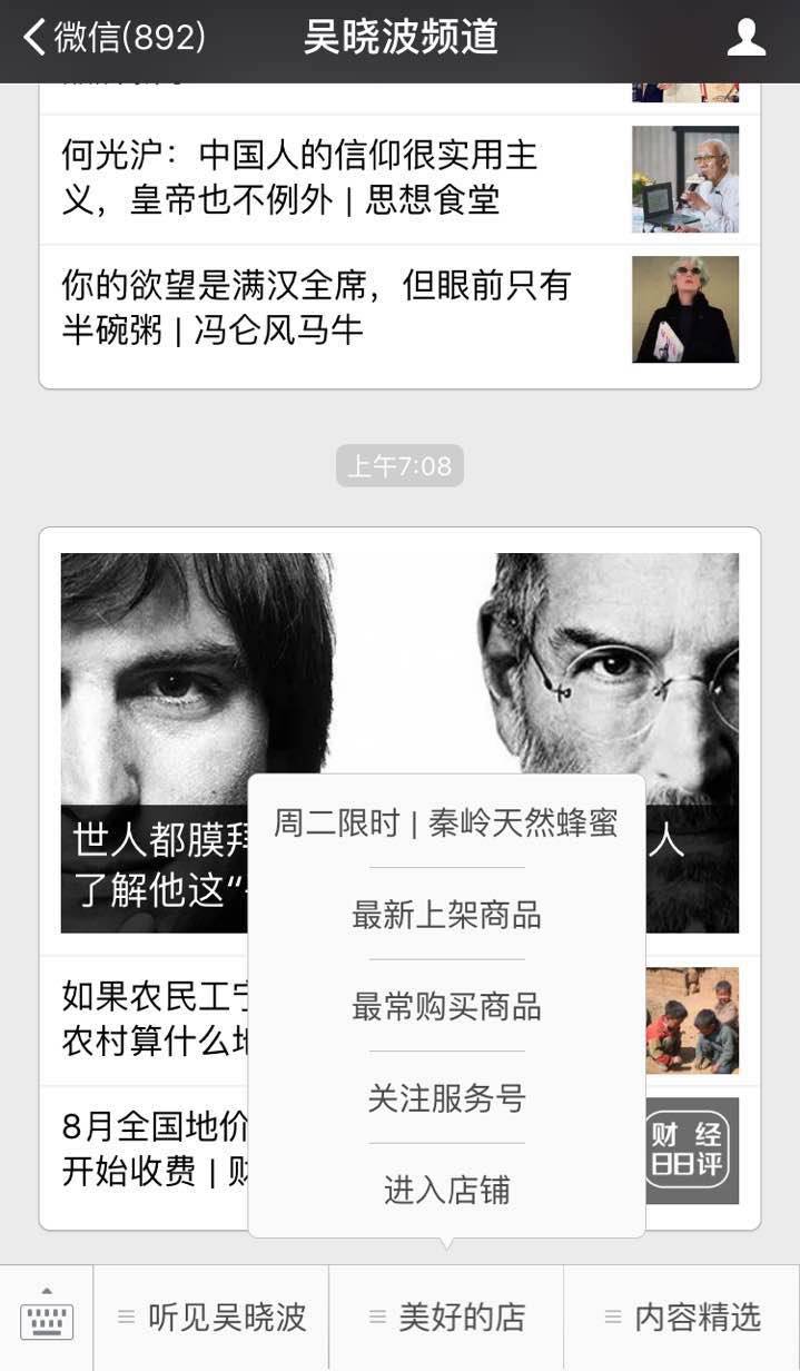如”罗辑思维”的好书推荐,将菜单栏以栏目的形式制作,找到适合自己公众号调性一致的长期话题栏目,会让粉丝养成习惯性一致的点击习惯。