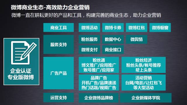 除了视频和直播之外,微博一直在为企业深耕好的商业工具和商业产品。微博对企业有专业的认证服务,并且可以让企业在微博上使用专业版微博。除此之外,商业工具方面,通过“微博活动”企业可以在微博上快速发起活动,获取粉丝,调动传播;“微博卡券”为用户发布卡券,转化到天猫或企业平台,完成用户购买。另外还有“微博红包”,既可以向新用户发起红包,获取粉丝,也可以向老用户发红包回馈用户,包括“微博橱窗”可以深度链接,都是非常成熟的玩法。
