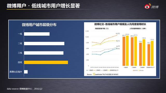 微博是不是只适合于一二线用户?如果企业的产品定位不是一二线用户,而是三四线城市用户怎么办?其实微博一直在实施城市下沉策略,2014年和2015年,微博都是侧重发展三四线用户。三四线城市两年期间增长50%的用户;在使用时长上,三四线城市2015年12月和2016年6月对比,使用时长有明显增长。做品牌策略和产品推广时,如何覆盖三四线城市,提供给用户大量购买机会,是我们企业需要探究的方向。