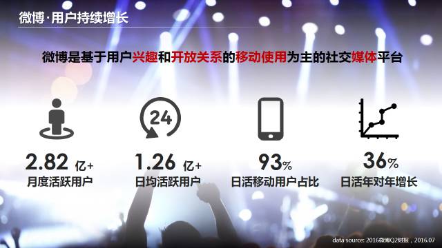 了解完热点事件微博传播数据,再来看一下微博的基础数据。上图是微博第二季度财报数据,微博月度活跃用户达到2.82亿,日活跃用户数1.26亿,其中93%的日活用户在移动端登录。强调移动端的原因是,怎么去服务移动端用户,让他们快速获取信息,完成转化,这是每一个做企业运营、营销都必须顾及、重点关注的问题。