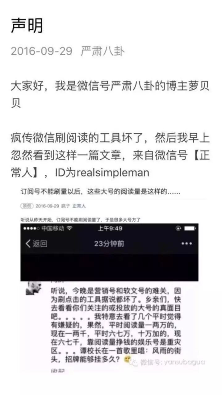9月29日上午,“正常人”发布推文《订阅号不能刷量以后,这些大号的阅读量是这样的……》,文中曝光了疑似刷量的公众号,“严肃八卦”也被提名,但经过“严肃八卦”博主本人证实,推文中的是山寨号。