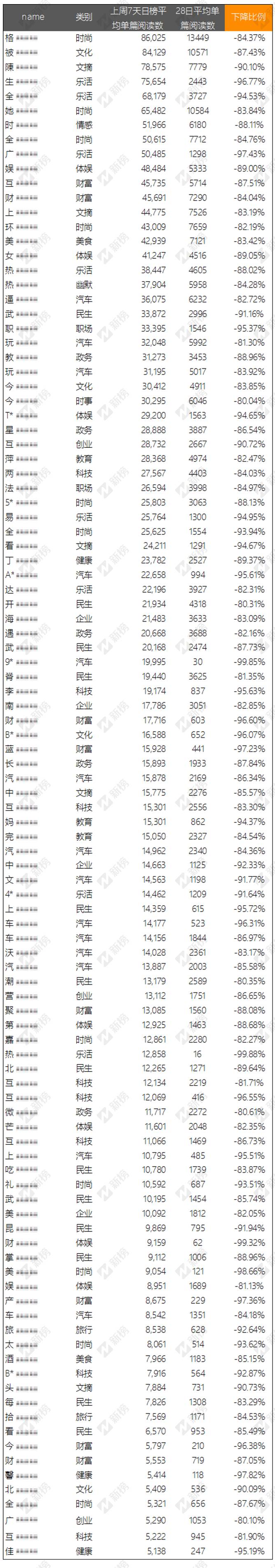▲其中,9月28日阅读数下降在30%以内(正常波动范围)的账号占比41.80%;阅读数下降在30%到50%的账号占比13.48%;阅读数下降占比在50%到70%的占比为5.55%;阅读数降低70%以上的占比为2.65%(232);阅读数降低80%以上的账号占比为1.42%(124)。