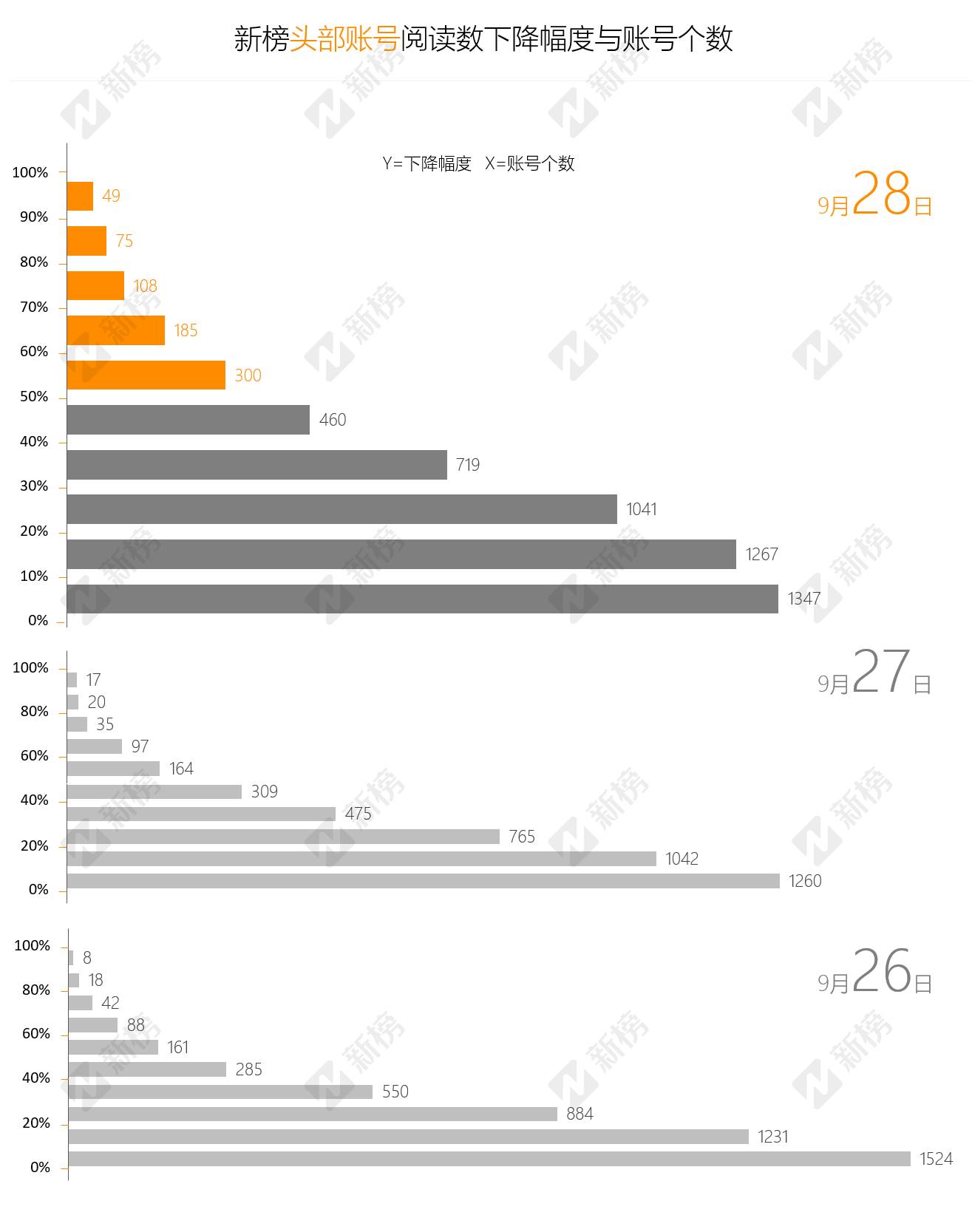 新榜选取长期位于新榜排行榜头部的8744个账号(2016年8月新榜指数750分以上),将其9月28日的单篇平均阅读数,与上周七天的日均单篇阅读数相对比,发现9月28日平均阅读数下降的账号的数量比9月26日、9月27日有增多趋势,其中,阅读数降低50%以上的账号数量,与之前两天相比有明显上升迹象。