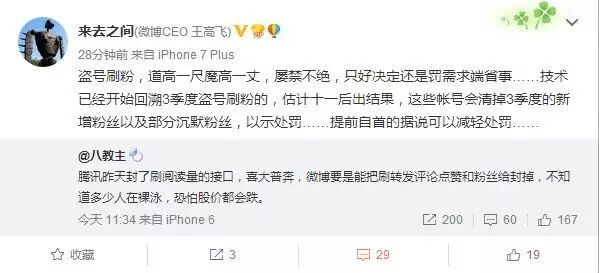 新榜讯 9月29日,微博CEO王高飞用个人微博号@来去之间 转发一条关于腾讯整顿刷阅读量现象的微博,回应对方关于微博“刷评论”的消息,称技术已经回溯3季度盗号刷粉,估计十一之后出结果。