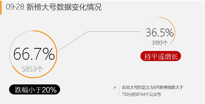 新榜选取长期位于新榜排行榜头部的8744个账号(2016年8月新榜指数750分以上),将其9月28日的单篇平均阅读数,与上周七天的日均单篇阅读数相对比。