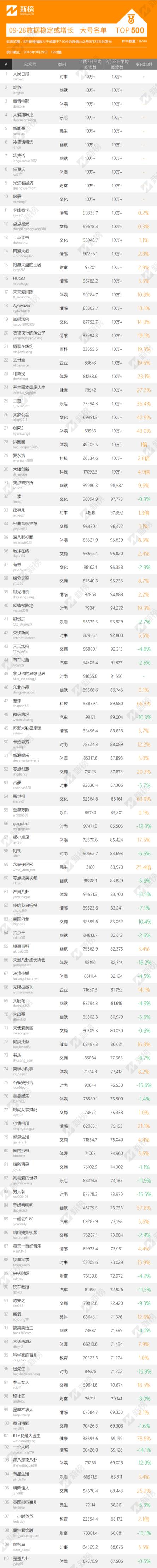 以下是跌幅小于20%或实现持平、上升的公众号TOP500名单(按9月28日单篇平均倒序)。