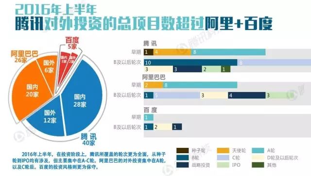新榜讯 10月9日,腾讯在腾讯科技官网上发布了中国创投领域资金风向报告(2016年上半年版),报告对2016上半年的中国创投圈的资金走向情况做了具体分析。由数据得出,2016年上半年,在投资阶段上,腾讯所覆盖的轮次更为全面,从种子轮到IPO均有涉及,但主要集中在A-C轮。阿里巴巴的对外投资集中在A轮以及C轮后。百度的投资风格则更为保守。