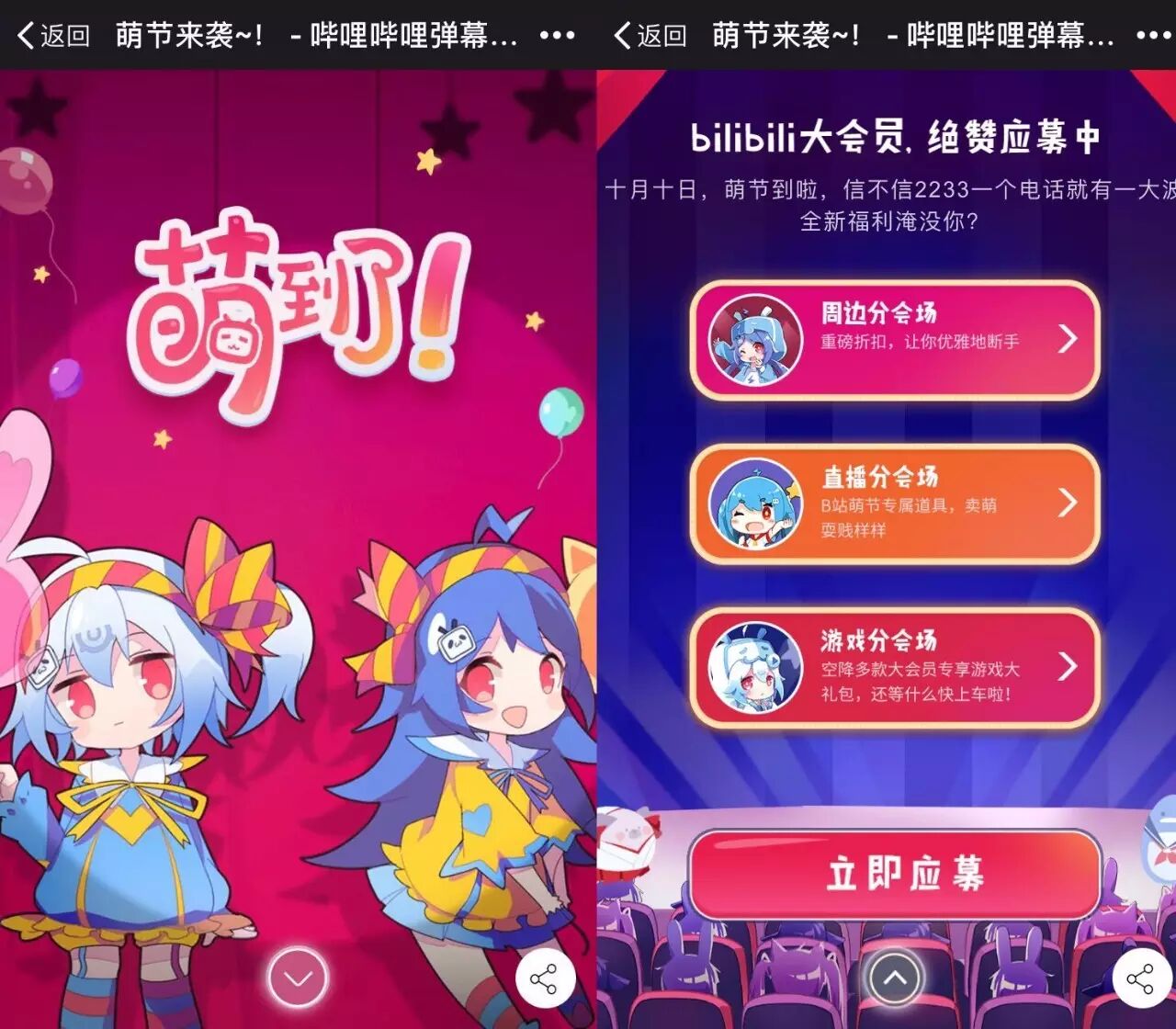 时隔一年,萌节又来,B站这次玩的是互动。今天,你打开B站的官网,无论是PC端还是手机端,都能立刻感受到B站对萌节的巨大诚意。这次的策划主题是“萌到了”,内容主要有会员招募、动漫周边销售、直播、游戏等,网页设计上大量使用了互动元素。