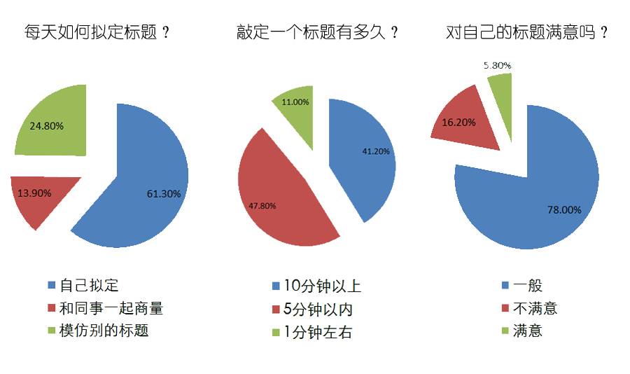 我们在很多运营者社群传播了关于拟标题的问卷调查,结果不容乐观。“自己拟定”标题的占60%,拟标题“耗时5分钟以上”的占90%,但是对自己的标题感到“满意”的却不到5%。