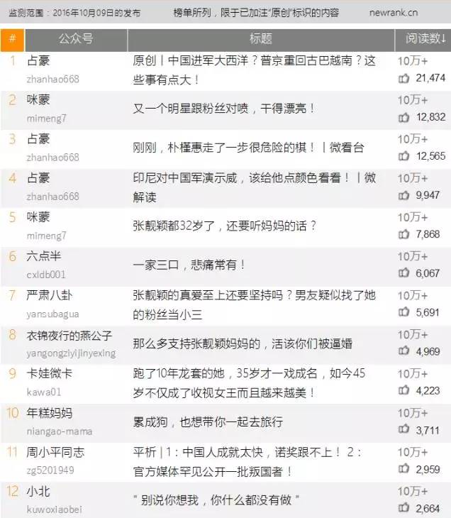 没错,就是新榜旗下“ 新榜排行榜”每日推出的微信公众号原创内容榜,榜单中聚集着前一天传播效果最好的微信原创内容,“咪蒙”“占豪”“视觉志”“毒舌电影”等热文标题在榜单中根据传播名次从上至下排开,这些深谙新媒体传播规律的大号个个都是标题高手,多看榜单,就像多借鉴好学生的作业,耳濡目染,必有收获。