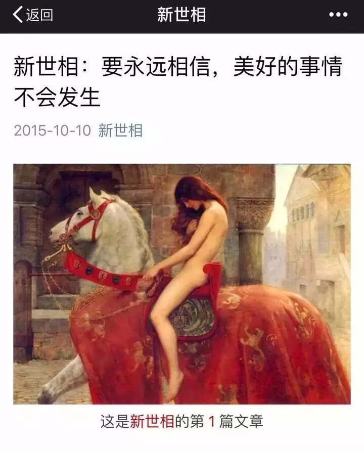 今年1月,张伟不得不给原来的头像,赤身裸体骑马的名画戈黛娃夫人穿上衣服,因为他在为“新世相”申请广告主的时候被告知“头像涉及暴力或色情”。最终,微博昵称为@甜椒Bazinga 的网友天才性地给戈黛娃夫人披上了一身红色袈裟,整体视觉上毫无违和感,但又有种无言反抗的俏皮意味。