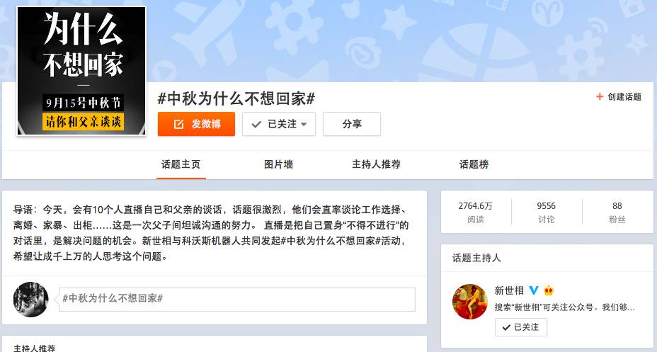 在“4小时逃离北上广”之后,“新世相”又进行了许多次活动策划,和科沃斯机器人联合策划的子女与父亲对话直播活动“中秋为什么不想回家”,数据同样很漂亮: