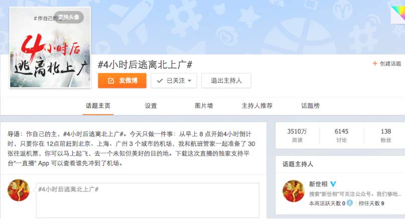 7月8日,活动文案在“新世相”公众号和微博上的阅读量双双达到近200万,微博话题#4小时后逃离北上#相关阅读量更是达到3500万之多,北上广直播间总观看量达到90万+。同时,“新世相”公众号当天涨粉超过10万。而且作为和企业联合发起的营销活动,航班管家提供了活动的费用。
