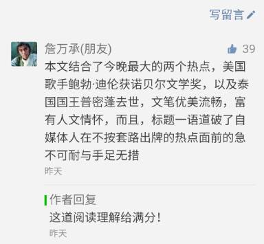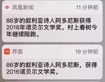 不过从正文来看,这应该是一篇有备而来的推送,除第一句话转达鲍勃·迪伦获奖消息,全文都在介绍善于长跑和网友眼中更善于“陪跑”的村上春树,但这样一篇稿件配上新颖标题,还是让“每日人物”成为昨晚最快推送。