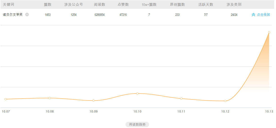 在新榜保持日常连续监测的27.8万微信公众号中,过去一周参与到“诺贝尔文学奖”话题创作的公众号有1254个,其中推送原创文章233篇。