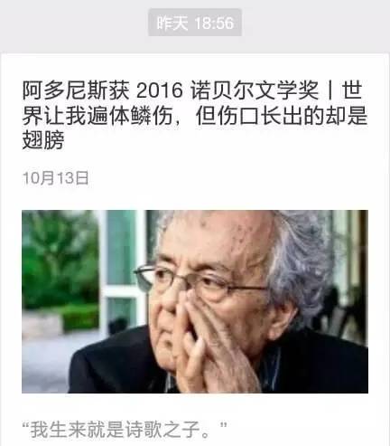 如果不是因为鲍勃·迪伦,这届诺贝尔文学奖应该和往年一样,在社交媒体的强势科普和背景介绍中,大家勉强记住一个陌生的名字,就像昨晚第一次被媒体大规模误传的叙利亚诗人阿多尼斯。