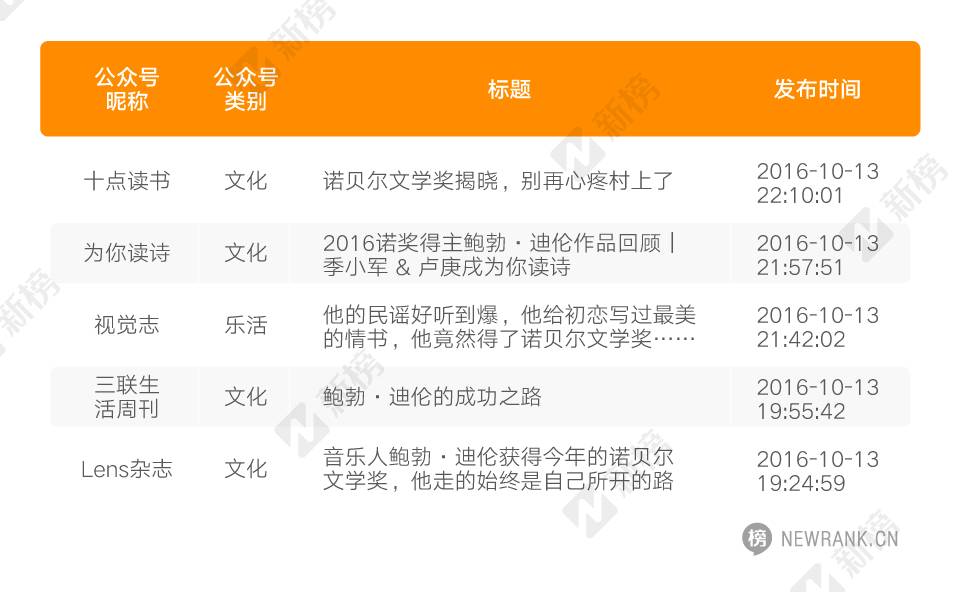 昨晚,从新榜保持日常连续监测的27.8万微信公众号来看,7点刚过7分钟,标榜“每天最精彩最生动的原创人物报道都在这里”的公众号“每日人物”已经率先跑赢大部队,成为第一篇报道鲍勃·迪伦得奖消息的微信公众号——《流行的村上春树输给了更流行的鲍勃·迪伦》。