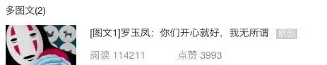新榜讯 10月17日,凤姐在其公众号“我就是凤姐”上发布文章《罗玉凤:你们开心就好,我无所谓》,回应了媒体关于凤姐搬家蹲坐纽约街头的报道,文章发出一天后就刷屏朋友圈,18日上午阅读量破10w+,获得3993人点赞,1千多人赞赏。