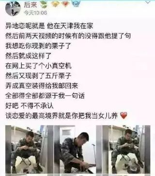 11日,网友“后来”在自己的QQ空间晒出了很温馨的组图,异地恋男友为她剥了5斤栗子,并亲手用机器做成了真空包装,快递给她吃。这一系列组图也受到了网友的疯狂转发。虽然事件的后续有点戏剧化,牵涉到了军媒,但不可否认,这事很暖并具有传播力。