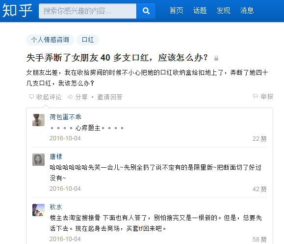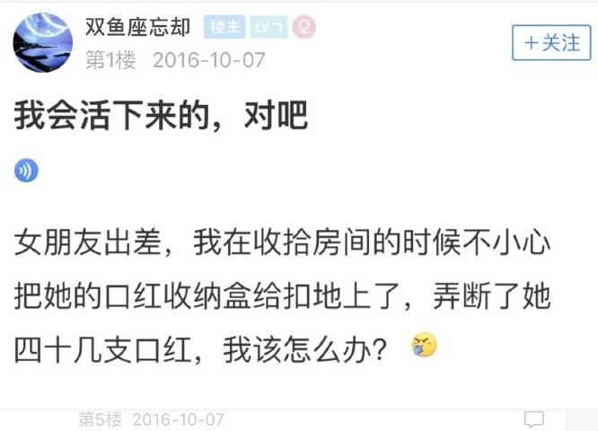 这半个月来,有一件贴吧里传出来的小事一直很火。10月9日之后,不少公众号都在转一篇百度贴吧的帖子,帖子的内容是某男子的求助:女朋友出差,我在收拾房间的时候不小心把她的口红收纳盒扣在了地上,弄断了她四十多支口红,我该怎么办?