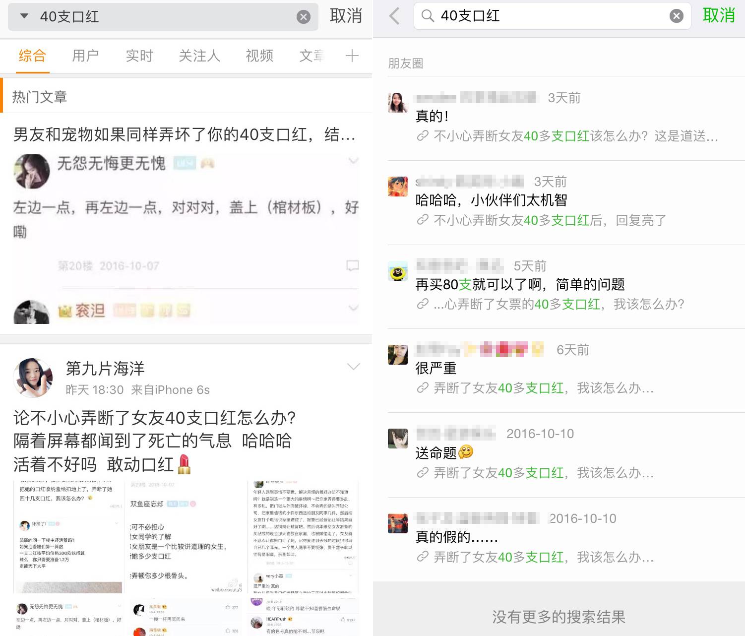 一篇加标点符号不过50字的求助帖,无图无真相,竟引起了轩然大波:贴吧的网友们疯了,疯狂留言,各种画风的都有;微博上,网友转截图的,转贴吧原文,转门户网站热文的,应有尽有;如果你打开微信的搜索,搜“40支口红”,你会看到很多朋友都转过相关内容,无论男女。