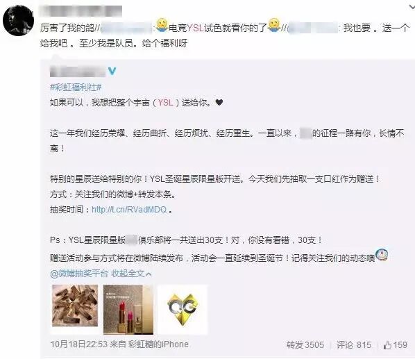 美妆博主发文发福利的营销推广方式比较常见,很多普通的化妆品牌都会采用。但作为一款限量版口红,YSL的星辰系列做的有些用力过猛,很多博主都在送,不止美妆博主,还有玩电竞圈微博账号,一个账号总共能送掉30支。限量版,难道不是说好的饥饿营销,送那么多真的好吗?
