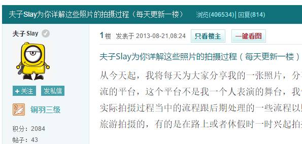 2013年,从业余摄影者成为图库网签约摄影师,相比头衔,他更在意在摄影中学习和钻研而收获的满足感,不时在论坛中发布一些摄影心得的“干货帖”。但令他意外的是,零星的资源分享使全国爱摄影的人迅速“聚沙成塔”,一篇“干货帖”,40万人浏览,800多人评论。