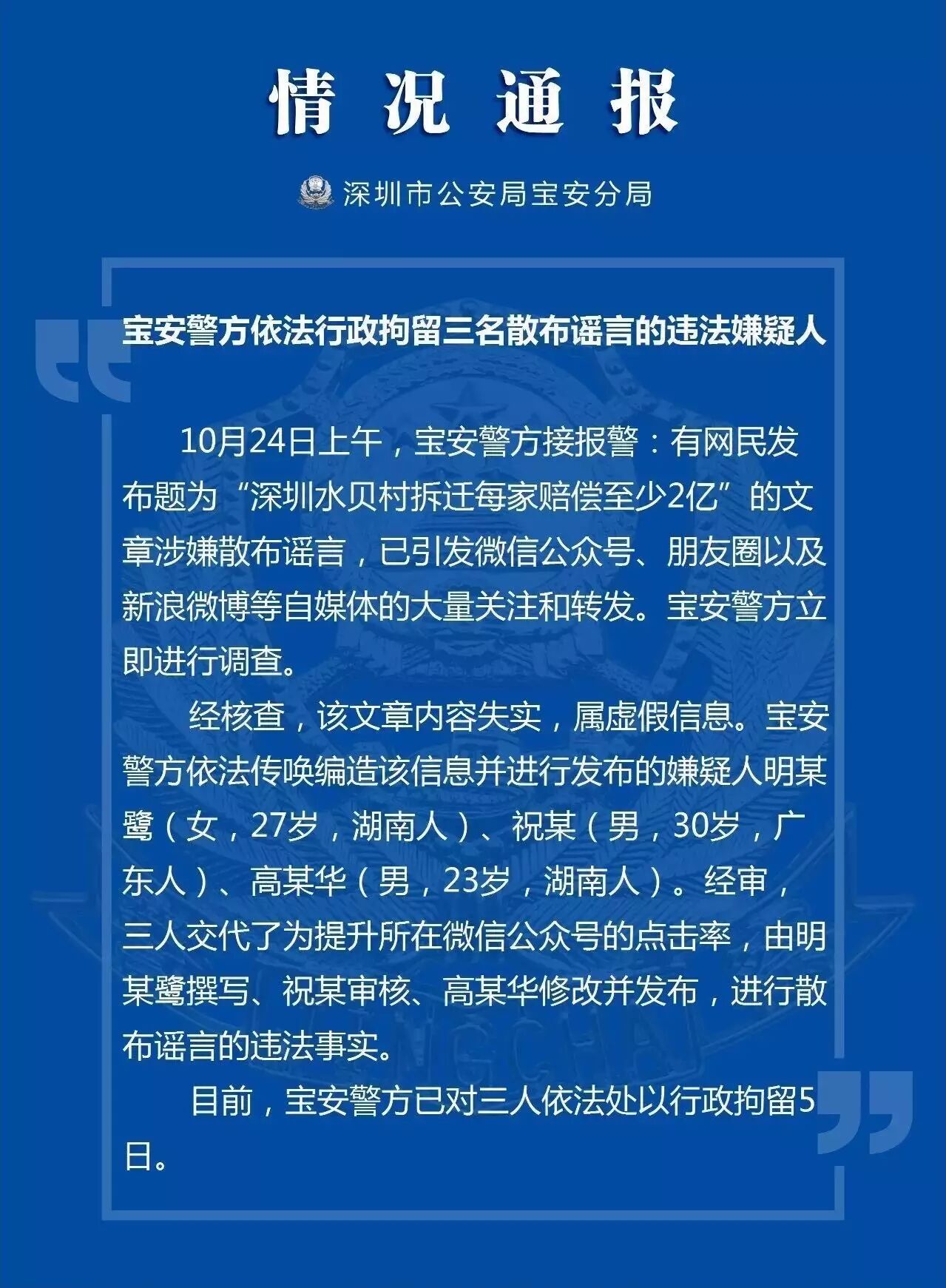 在不少人信以为真时,10月26日晚上,“宝安公安分局”发布文章《深圳某知名微信公众号小编因造谣被抓》,文中指出“水贝村补偿两亿”系谣言。据宝安警方调查,该微信号为提高关注度和点击率,故意造谣,现宝安警方已对三名造谣人员,处以行政拘留五天的处罚。