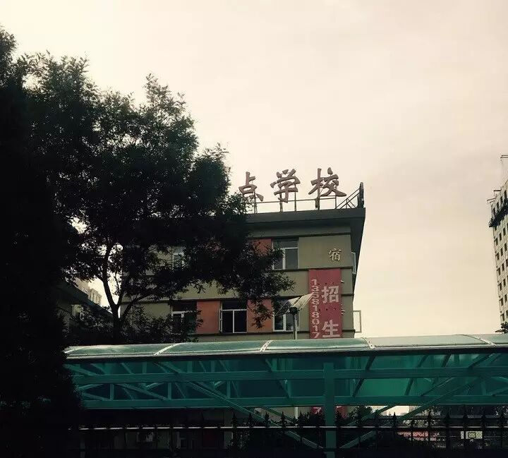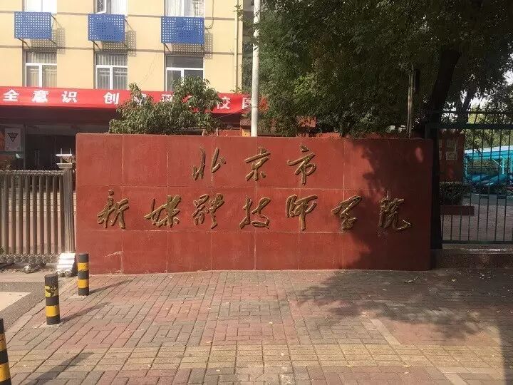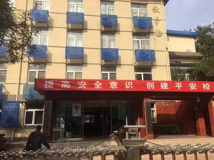 ▲ 正对大门的教学楼入口处挂了两块牌子,左侧是“北京市实用高级技术学校”,右侧是“北京市新媒体技师学院”。