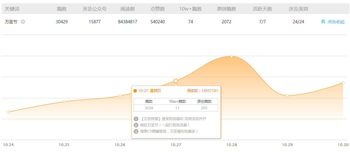 新榜讯 万圣节临近,与其相关的各种文章近日刷屏朋友圈。不少人在各种社交软件上晒出了自己万圣节“节日照”,其话题热度持续上升。据新榜每日持续监测的29.4万数据样本显示,10月24日至10月30日的7天时间中,提到“万圣节”的微信文章达3万多篇,包含74篇10w+。