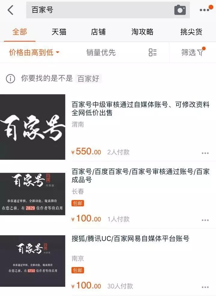 ▲奇货可居之下,百家号在某宝上被炒到几百元一个,而且还真的有交易。