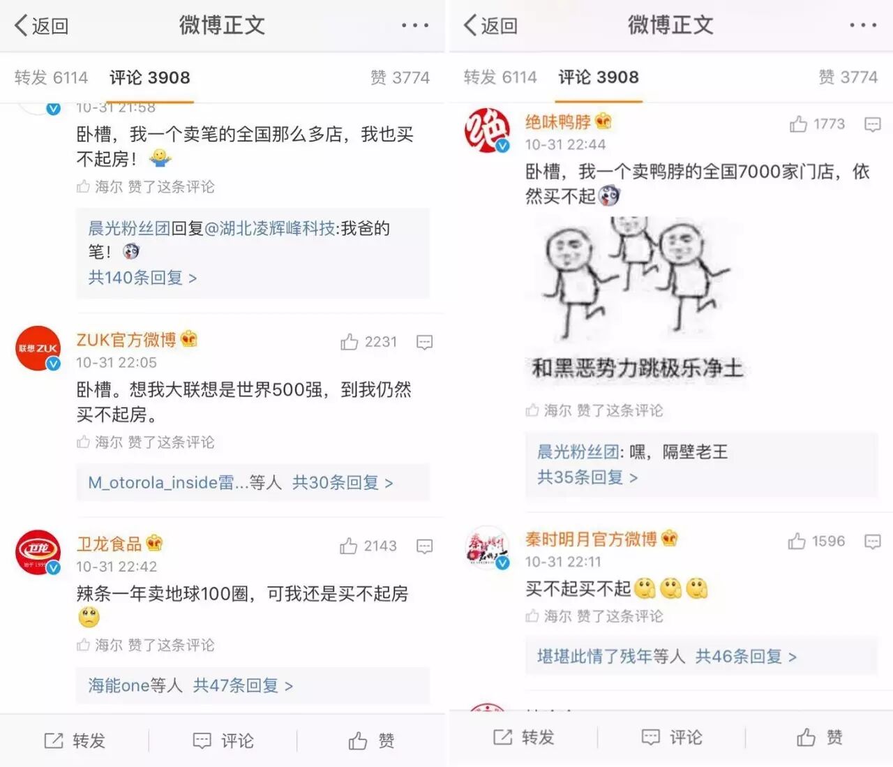 海尔回应万达的那条微博虽然没有形成像@章漁大小姐那么大的转发量,这中间也有微博对于企业号的一个限制,但是自10月31日发布以来,截至目前总转发量也已经达到了8891条,并且阅读量也已经达到了百万级,获得了一众蓝V们的纷纷响应和支持。海尔官微根据网友的脑洞,趁势发起了“虽然______#但我还是买不起买#”的造句话题,目前的阅读量也已经超过了150万,无论是从营销还是公关的角度来说也可以算是比较成功的。