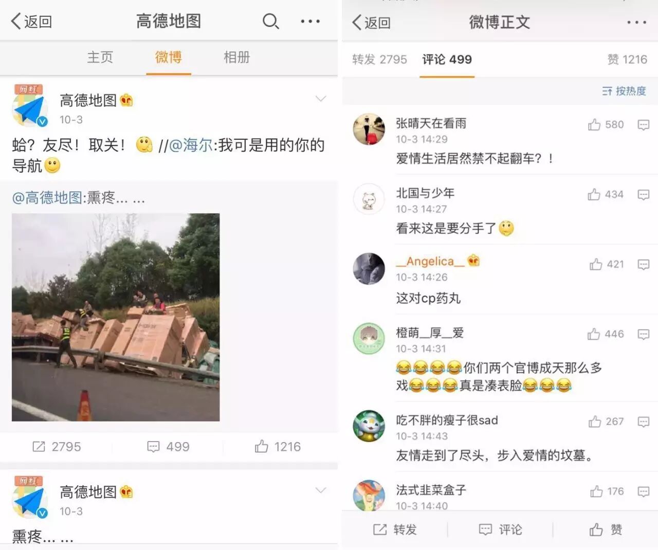 海尔官微的画风一向都是满满的基腐味。上个月一辆满载海尔冰箱的货车翻倒在高速路上,高德地图拍图发微博称“熏(心)疼”,结果海尔立刻回应“用得是你家的导航”,迅速引来各路网友围观,该条微博转发量截至目前已经达到16601条。