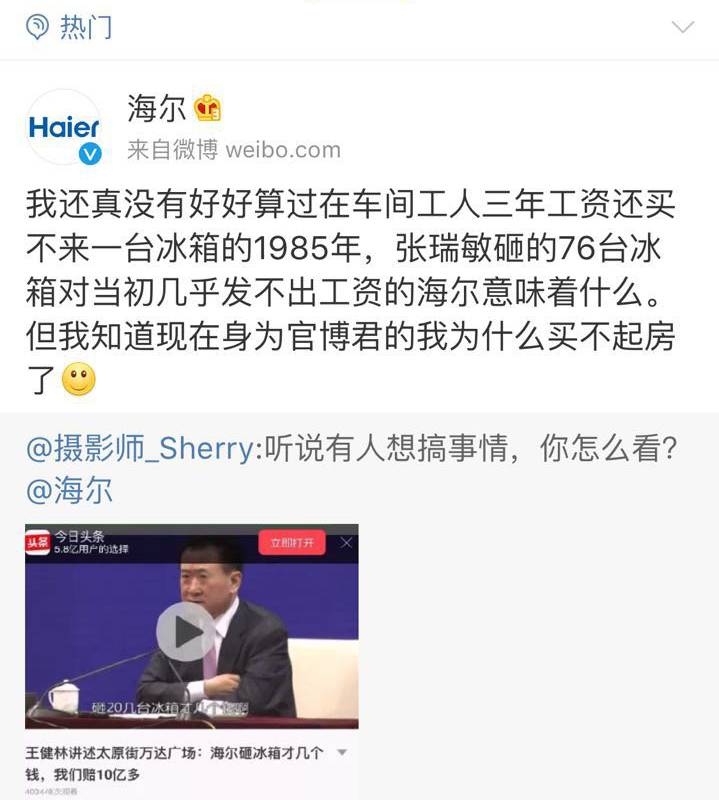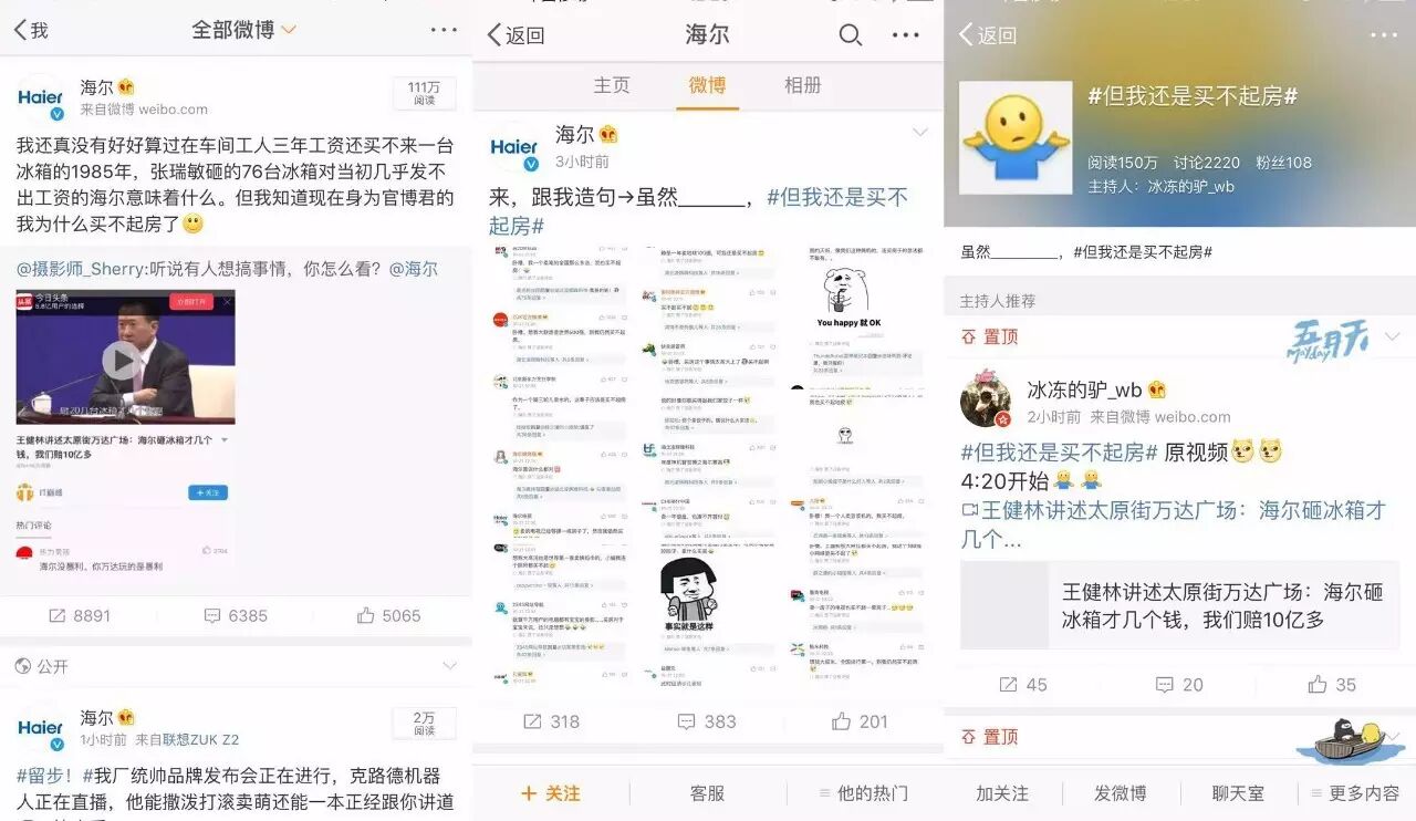 同样的事情再次上演,这一次的主角换成了海尔的官方微博。31日海尔转发了一条王健林在万达学院开学典礼上的一段讲话,引得大量商家的官方微博再次围聚转发留言。王健林在讲话中表示当年张瑞敏砸76台冰箱不算什么,万达地产曾经在一次项目中赔了近10个亿,一向以卖萌搞基著称的海尔官微的回应巧妙表达了当年张瑞敏砸冰箱对海尔乃至制造业的影响,买不起房的梗更是迎得了粉丝一边倒的力挺,吸引了近300家品牌的“声援”。
