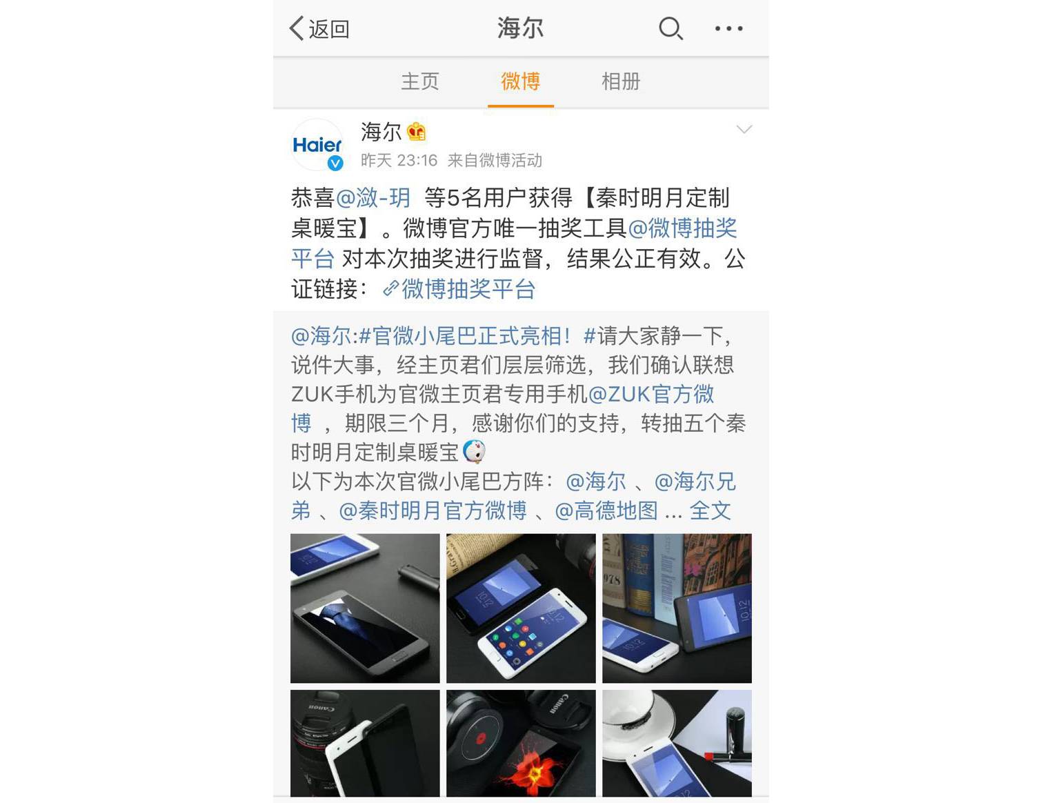10月的时候海尔官微联合10家蓝V发起了一个“微博小尾巴”的活动,利用微博显示发布手机的功能进行联合推广;第一波结束之后迅速又开始了第二波,更多的主页君加入了进来,最终确认了联想ZUK为主页君专用手机。