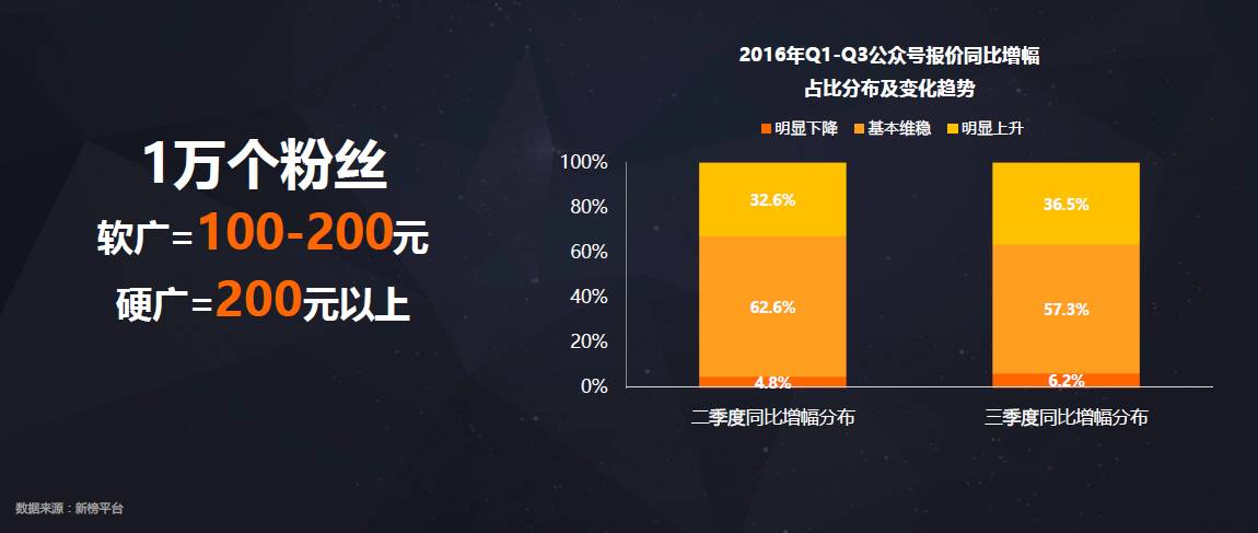 我们知道,头部永远都是一小部分。比如说我们有过一个统计,如果以微信日PV是30亿来算的话,中国微信500强占到2.5亿左右,这是一个极小的金字塔尖。根据新榜平台监测数据,2016年Q1-Q3期间,单个公众号的投放成交价格,半数在5千-5万元之间,5千元以下的成交价格也是主流。