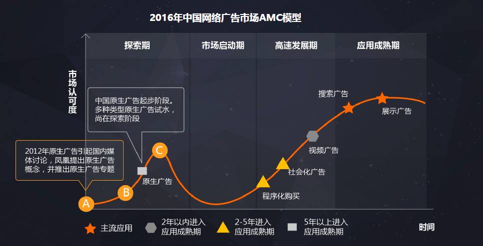 在中国,原生广告还处于探索时期。下图的曲线提到了,每一种广告形态出现以后,从开始到发展,到繁荣昌盛,再到探索出更多模式之间的趋势。中国大约在2012年提出了原生广告的概念,然后逐步试水,现在已经进入到积极探索的时期。相比较而言,像程序化购买、DSP还有一些视频贴片广告,已经发展到成熟期,而原生广告在中国还有非常大的发展潜力和探索空间。