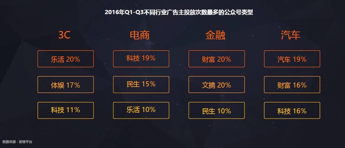 从不同行业广告主投放次数最多的公众号类型,我们得出一个结论,广告主更倾向于“门当户对”的投放。我们看到3C类可能更倾向投放乐活类的公众号,比如讲怎样摆放家居的;电商类的可能首先要去影响科技圈层的KOL;金融类的则是面向期望获得财富自由和更多财富积累的社群。