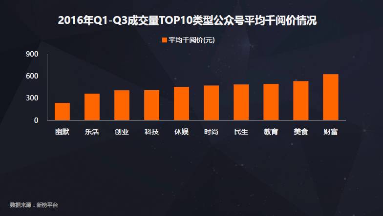 新榜数据显示,整体平均千阅价为514元。大家可能会觉得真的有这么高吗?这里我解释一下,这个千阅价是以10万阅读数为基础的,没有计入10万以上的数字。所以真正的千阅价可能会低一点,但我们预测下来也应该在400左右。大众号的千阅价会低于垂直号。财富、美食、教育是平均千阅价最高的,而幽默类别是千阅价最低的。
