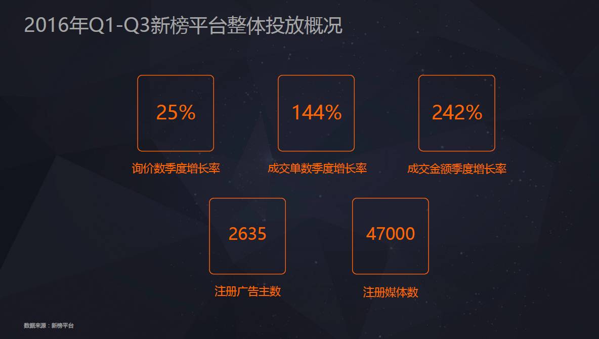 这是前三季度在新榜平台上我们观测和记录下来的一些交易数据。从整体来看,不管是广告主询购还是成交的金额都呈现出非常快速的增长。