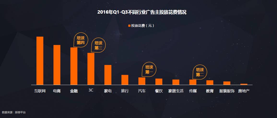 首先,我们看到互联网类别的广告主是投放额度最高的。新兴的公司,不管是App、游戏类型的,都有非常高的投放额。前几大类正是我们平常感受到比较多的类型,包括互联网、电商、金融、3C、家电、汽车这样一些类别。