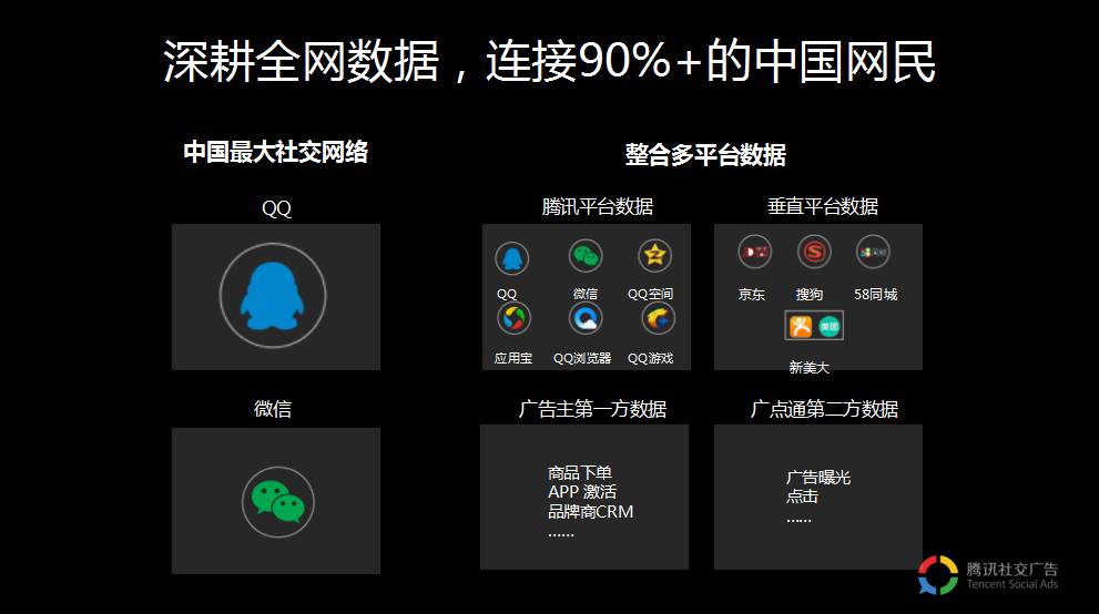 分享一个数据,几乎所有用户的上网时间的40%都贡献给了QQ和微信,这里面微信时间多、QQ在年轻人中粘度高、活跃度高。实话实说,腾讯和腾讯社交广告的核心能力确实是数据。“大数据”这个词汇在我的团队里是“禁用词”,我一直强调,数据就是数据,我为什么把“大”字去掉,是因为你怎么定义大、怎么定义准。这个“大”是数据自然形成的,而“准”还是在于数据找到的流量和人群。但是在流量和人群的角度上来说光说“大”,是非常没有意义的,要说数据的话,我们在这里提到的是“数据”和“深度”两个概念,“大”是一个虚的概念,但是我们整体确实能够做到精准。