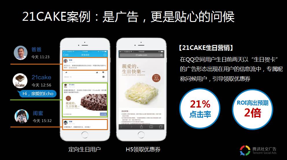 举一个真实的例子来说,一个在QQ空间投放的信息流广告,上面是爸爸发送的内容,下面是闺蜜说的话,中间是一个结合用户生日推送的21Cake的生日营销广告。这是一个和用户说话的广告,叫得出用户名字,针对用户所在的具体场景,这就是非常具有对话性的广告。整个广告从素材到最后引发连续点击的创意,都让你觉得是在一个懂你的人交流。提供的是和用户相关性、针对性极高的场景营销和产品交流。这种广告不用关心点击率,点击率不是问题。